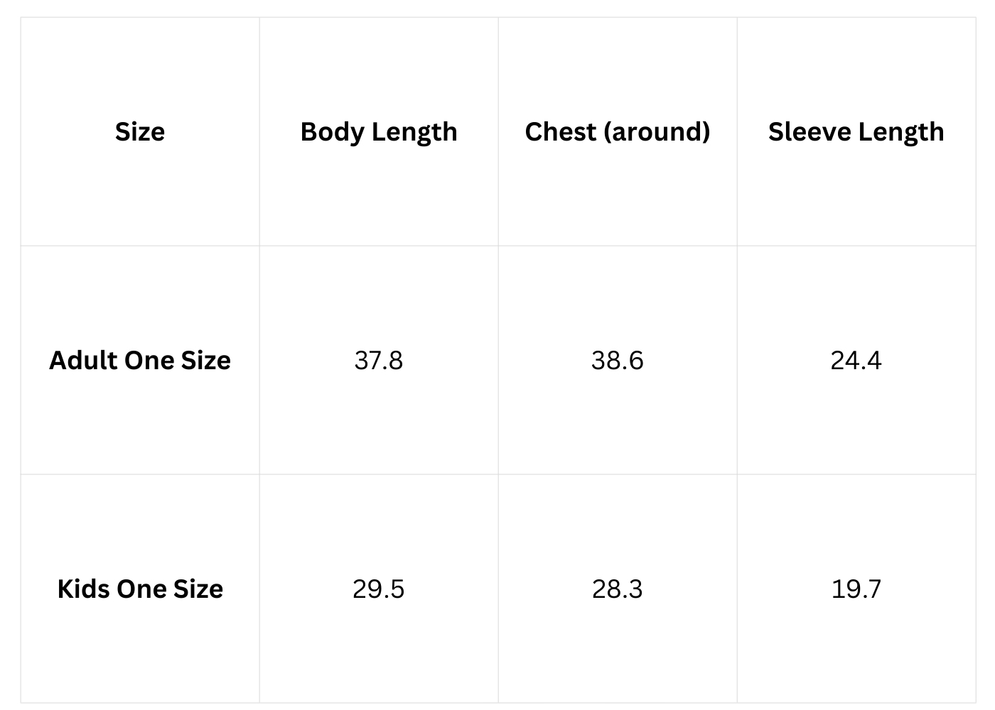 Size Chart (inches):