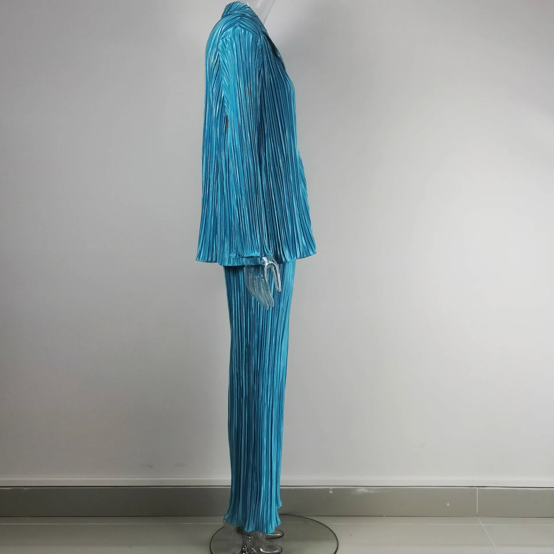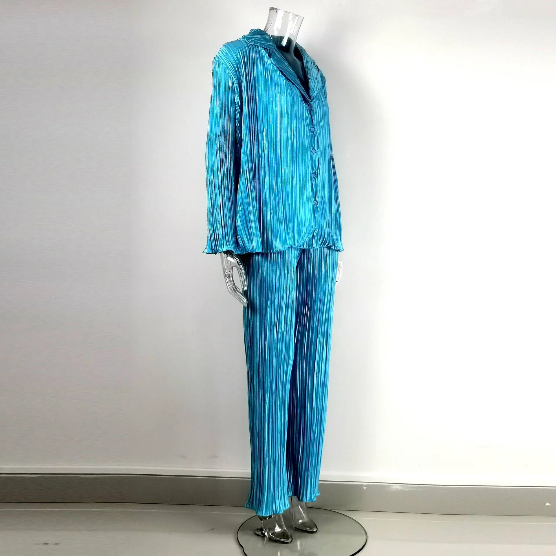 Step into a world of refined style with this Spring-Summer 2 Piece Streetwear Set. The outfit begins with a flowing, button-up shirt that elegantly drapes over the form, paired with flared trousers that echo the same pleated design for a cohesive look. The fabric's pleats create a sophisticated texture, offering both visual interest and a comfortable fit that moves with you. Whether you're headed to a day at the office or an evening out, this set transitions smoothly across your day's activities, providing a polished appearance with an effortless feel. The ensemble is a testament to timeless design, bringing an air of grace and poise to any setting.