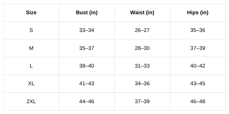 Size Chart (Inches):