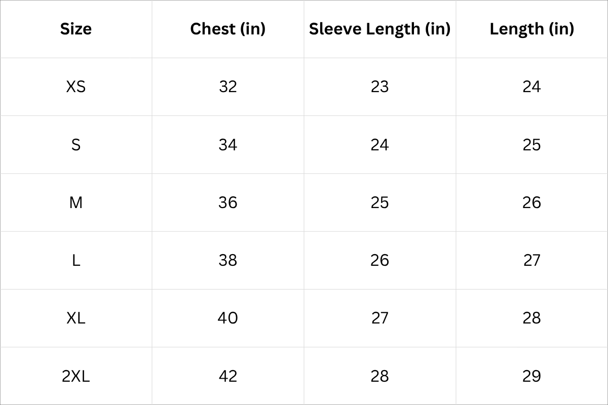 Size Chart (Inches):